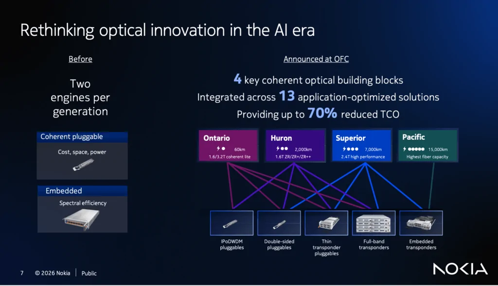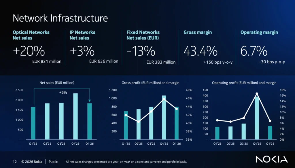 作为公司的核心增长板块,网络基础设施收入同比增长6%至18.3亿欧元。光网络表现尤为突出,收入大涨20%达到8.21亿欧元,主要受AI与云客户在数据中心互联(DCI)系统、可插拔光模块和线路系统方面的强劲订单推动。IP网络收入增长3%,得益于AI驱动的数据中心交换与路由需求;固定网络收入因转型至光纤与基础设施产品而下降13%。诺基亚认为,光网络和AI基础设施的加速需求是增长的关键引擎。