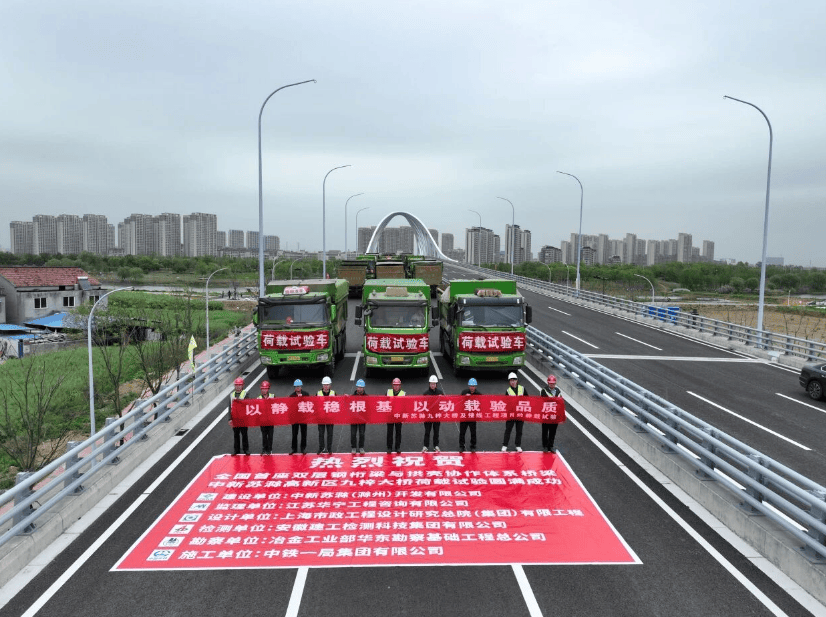 此次荷载试验分为静载试验和动载试验,由建设方委托独立第三方进行检测,业主方代表、监理单位等全程跟检。静载试验时,采用12辆载重为35吨的加载车,通过高精密仪器,对大桥5个不同试验工况的主梁挠度、支点沉降、钢拱变位、焊缝、异常现象等进行测试或观测,以反映结构的最大变位和变化规律,并与理论值进行比较,从而评估桥梁工作性能。经过一天的现场测试,项目各项参数指标均符合相关规范要求,顺利通过测验。