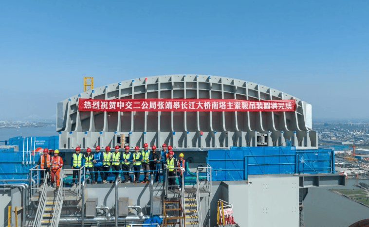 中国张靖皋长江大桥南主塔自行走索鞍全部吊装完成