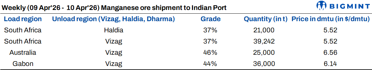 印度进口高品锰矿价格周环比微涨