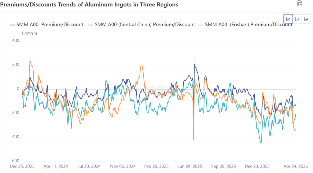 维度网讯,截至4月24日,中国华南与华东铝现货价差持续走扩,两地价差超过200元/吨,覆盖海运及物流成本,跨区域调货经济性显现。华南市场SMM A00铝(佛山)对2605合约贴水345元/吨,华东市场SMM A00铝对2605合约贴水130元/吨,粤沪调货窗口正式开启。