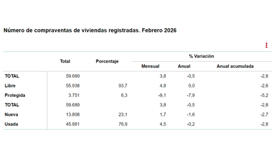 维度网讯,西班牙国家统计局发布最新报告,显示2026年2月房地产交易量同比下降0.5%,约为59700套,连续第二个月出现下滑。Pisos.com研究总监费兰·丰特认为,这一调整“非常温和”,发生在市场高度活跃的背景下,过去12个月累计房地产交易量仍处于高位。