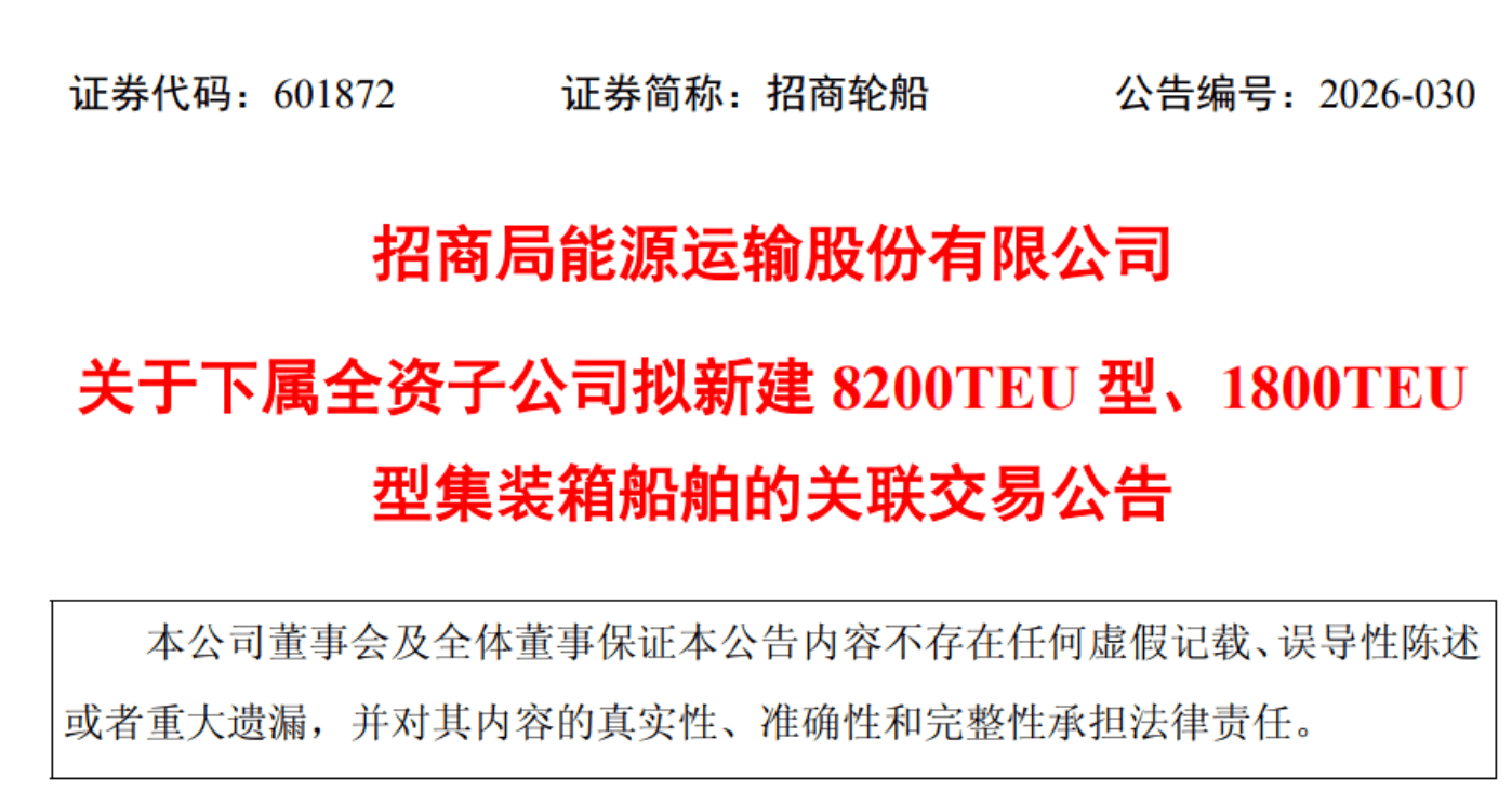 根据公告,招商轮船拟通过下属全资子公司设立的单船公司与关联方招商局船舶工业集团有限公司(招商船舶)下属公司签署《船舶订造协议》,拟新造4艘8200TEU型甲醇预留集装箱船和4艘1800TEU型集装箱船,项目总投资预计不超过38.14亿元,交船期为2028年。