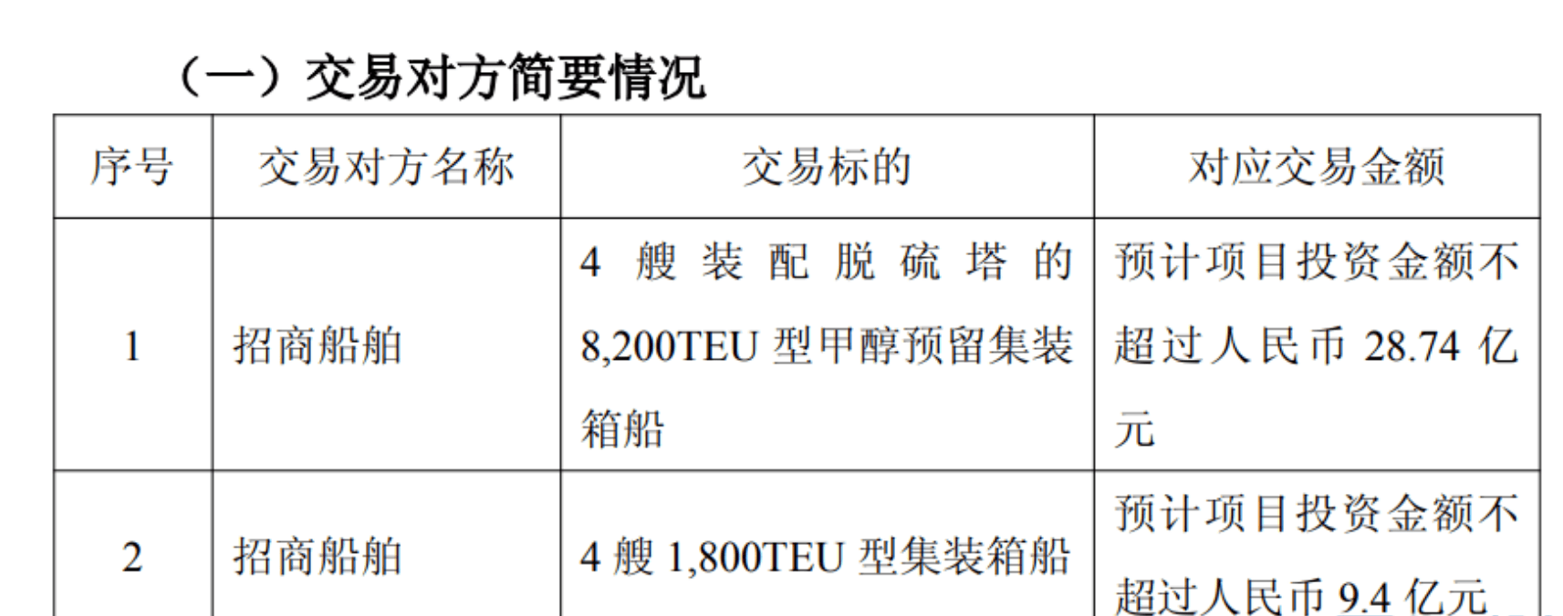 具体而言,4艘8200TEU型甲醇预留集装箱船配备脱硫塔,预计投资金额不超过28.74亿元,以此计算,单船造价预计不超过7.185亿元;预计4艘1800TEU型集装箱船的投资金额不超过9.4亿元,以此计算,单船造价预计不超过2.35亿元。该批新船分别由招商船舶旗下两家船厂建造。