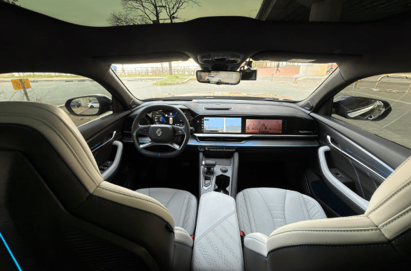 车内空间宽敞,首次配备副驾屏幕和电子后视镜,座椅带通风功能,并配有氛围灯、主动降噪和隔音玻璃。驾驶模式提供AI模式,可学习驾驶员习惯调整转向和油门响应。