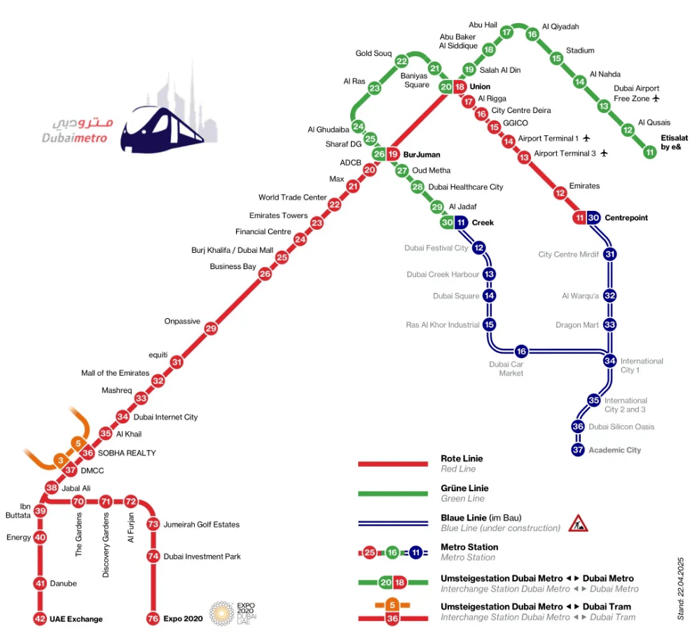 除机场快线与2020年世博会专线延伸段外,迪拜仍在推进多项轨道交通规划。其中,蓝线由中车香港-土耳其MAPA-土耳其LIMAK联合体承建,项目合同约合56亿美元,线路全长约30公里,截至今年1月,已完工12%;金线已选定由美国Aecom提供咨询服务,线路自阿尔古拜巴出发,平行分担既有地铁红线客流压力,并向内陆区域延伸;此外,紫线和粉线仍处于早期规划阶段。