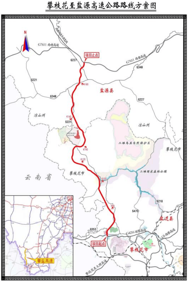攀盐高速公路全长约131.3公里,其中攀枝花境内约86.3公里,凉山州境内约45公里,全线采用双向四车道高速公路标准建设,设计时速80公里,路基宽度25.5米,全线共设桥梁67座、隧道20座、互通式立交10处,桥隧比高达80%,预计建设工期6年。这条高速公路建成后,攀枝花市区到凉山州盐源县的车程将由原来的5小时缩短至约2小时。