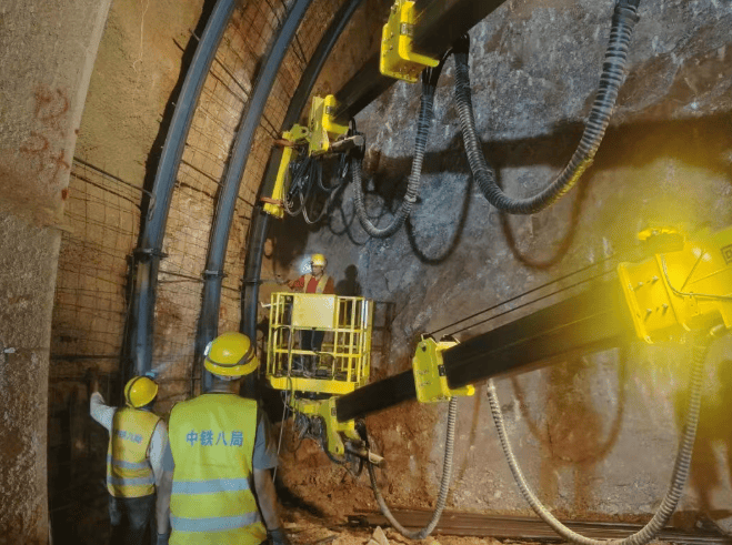 在初期支护中,成套机械的协同优势更加凸显,钢拱架安装机采用遥控操作,同步提升施工精度和效率,降低了安全风险。混凝土湿喷作业采用混凝土湿喷台车双机协同施工,每循环用时3小时以内,提升了施工效率和质量。