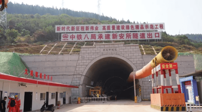 新安所隧道位于蒙自市新安所镇,全长3569米,最大埋深约234米,进口内轨顶面高程1479.79米,出口内轨顶面高程1395.92米,隧道内纵坡设计为单面下坡,地质条件复杂,是文蒙铁路建设中的重点控制性工程之一。