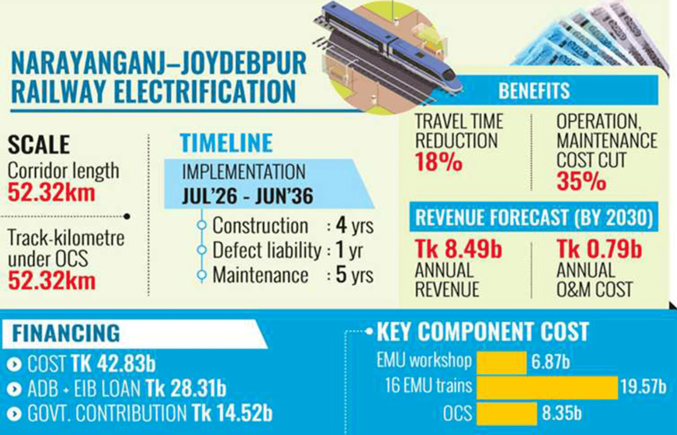 维度网讯,孟加拉铁道部已提交一项发展项目建议(DPP),拟对纳拉扬甘杰至乔伊德布尔段铁路实施电气化改造,并引入电力动车组,项目总投资约428.3亿塔卡(约合3.47亿美元)。该项目将成为孟加拉国首个铁路电气化工程,标志着其铁路系统将迈入电力牵引时代。