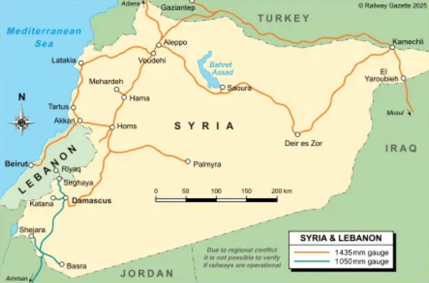 据蔚蓝轨迹《叙利亚轨道交通国别报告》,叙利亚铁路全长约2750公里,主要采用1435毫米标准轨距。受内战影响,叙利亚铁路系统一直处于瘫痪状态。2025年8月,阿勒颇至哈马铁路恢复试运行,截至2025年10月,已有1052公里铁路恢复运营。叙利亚交通部计划在五年内推进基础设施重建和全面恢复铁路运行;此外,在区域联通上,土耳其联合叙利亚与约旦签署重振汉志铁路谅解备忘录,计划修复叙利亚境内关键铁路段,并连接约旦亚喀巴港。