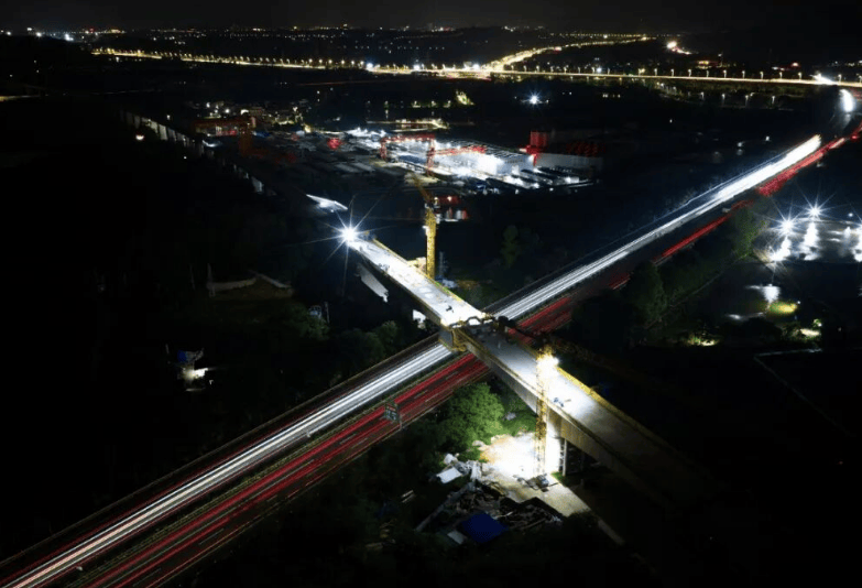 跨广明高速公路特大桥全长7.6千米,共设6联连续梁。本次合龙的连续梁上跨广明高速公路,是整座大桥的控制性工程,也是全线架梁通道的关键节点。该连续梁采用智能悬臂造桥机施工,所跨越的广明高速公路为双向6车道,车流量大,桥梁主线与公路夹角60度,梁底距离公路面最低高度仅7.23米,且桥墩临近燃气管道,施工环境复杂、安全风险高、施工难度大,属于珠肇高铁全线重难点控制性工程之一。