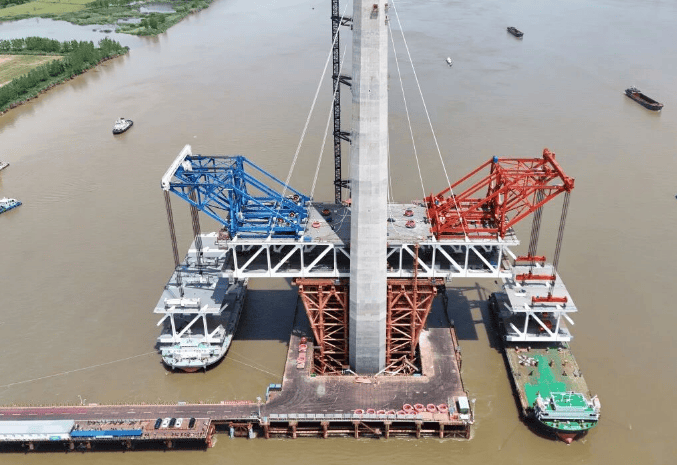 中国安徽池州长江公铁大桥北岸主跨首对钢桁梁吊装完成