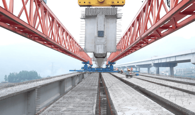 中铁十六局集团安盘高速项目总工程师鲁盼介绍道:“冬瓜山大桥是我们标段施工难度最大的桥梁工程,也是标段控制性工程,针对72米高墩施工难题,我们采用液压爬模施工方案,精准控制墩柱垂直度与施工精度,筑牢施工安全防线。同时,由于施工区域山路崎岖,全长17公里的运输路线给大型架桥机、140吨重预制梁的运输带来极大挑战,加之施工场地狭窄,多工序交叉施工组织难度突出。为破解这些难题,我们创新实施‘双梁场战略’,同时精准规划运输路线、优化调度流程,成功破解了长距离、高难度运输难题。”