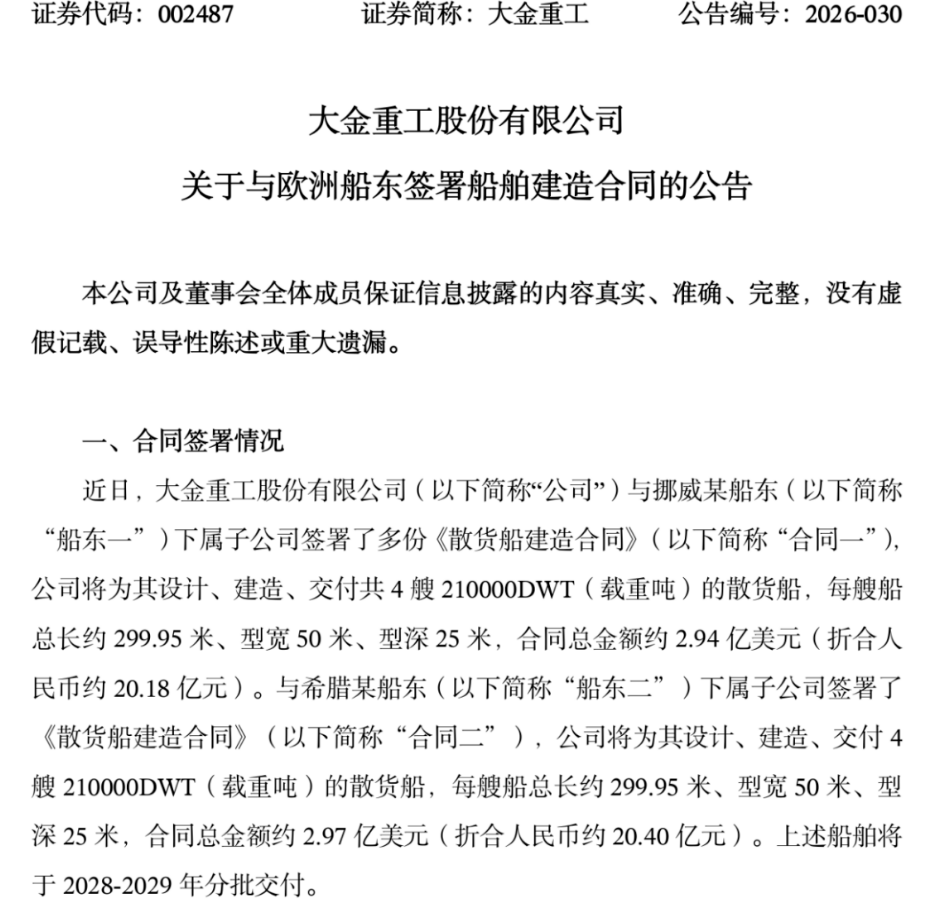 维度网讯,4月下旬,中国大金重工股份有限公司(以下简称“大金重工”)发布公告称,公司与挪威某船东和希腊某船东签署船舶建造合同,订单金额合计近6亿美金(折合超过40亿元人民币),共包含8艘散货船(每个船东各下单4艘),单艘船价格约5亿人民币。每艘船总长约299.95米、型宽50米、型深25米。