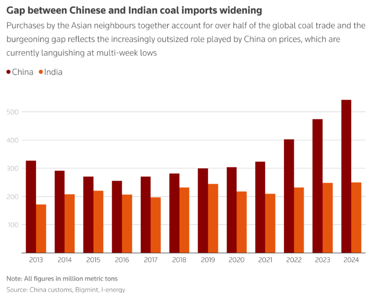 LSEG煤炭市场研究主管Toby Hassall指出,今年中国的煤炭采购量占全球煤炭市场进口量的创纪录比例,达到41%。业内人士分析指出,由于煤炭市场中,国内价格更具竞争力,中国买家去年对外国煤炭的偏好有所增加。与此同时,印度虽然也试图提高煤炭产量以降低进口费用,但受生产成本低的影响,其煤炭价格更具竞争力。不过,印度在2024年的动力煤进口量仍下降了约3%,而中国在前11个月的进口量则增长了13%。