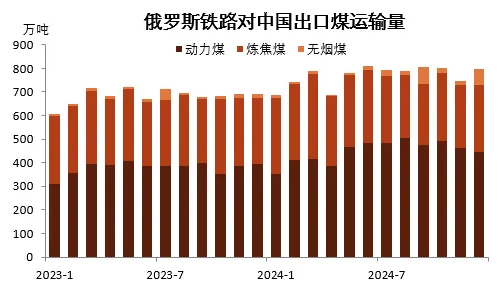 金属与矿业信息咨询公司 (Metals & Mining Intelligence)的初步数据显示,12月份,俄罗斯经铁路运输的以中国为目的地的煤炭出口量为796.5万吨,环比增6.80%,同比增15.20%。具体而言,动力煤运输量为446.5万吨,环比降3.73%,同比增13.50%;炼焦煤运输量为283.4万吨,环比增5.79%,同比增0.53%;无烟煤运输量为66.6万吨,环比增372.34%,同比增313.66%。2024年全年,俄罗斯经铁路运输以中国为目的地的煤炭出口量总计9230.7万吨,同比增长12.65%。