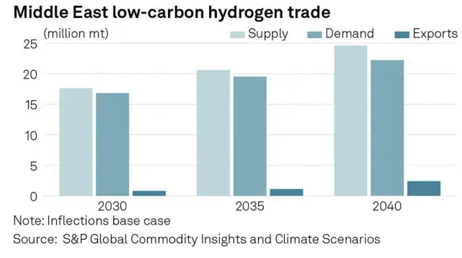 Commodity Insights 的数据显示,预计到 2030 年,中东将生产 1760 万吨氢气,出口 80 万吨氢气,其中大部分为低碳和可再生氢气。