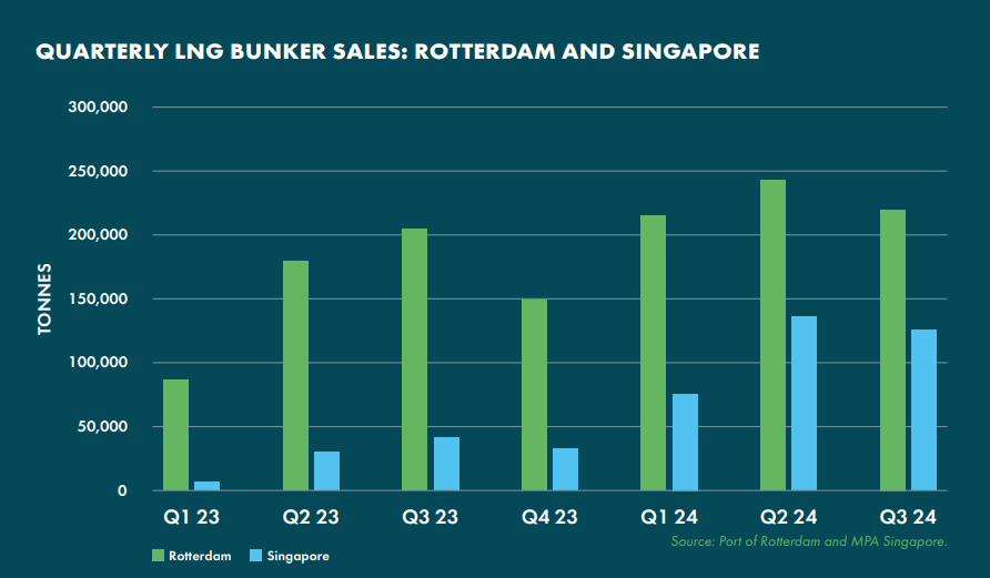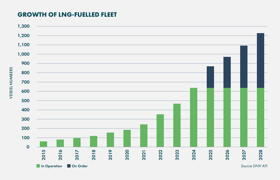 行业联盟SEA-LNG发布的一项新分析显示,全球液化天然气(LNG)应用和海运业将在2024年迎来显著增长。根据SEA-LNG年度《舰桥视角》报告,全球每年运营的LNG燃料船舶数量已从2024年10月分析的590艘增至683艘,增长了33%。此外,去年已有169艘LNG双燃料船舶投入使用,占2024年替代燃料船舶订单吨位的70%,这一比例较2023年的43%有明显上升。