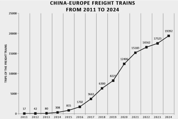 据中国铁路集装箱运输(CRCT)统计数据显示,2024年中国与欧洲之间的中欧班列开行量达到了19,392列,同比增长10.7%。这些列车共发运了2,077,216标箱的货物,同比增长9.2%。这一数据反映了中欧之间贸易往来的持续活跃和铁路货运的重要性。在这些列车中,有10,546列出境前往欧洲,8,846列入境到达中国。这一流动不仅促进了货物的交换,也带动了人员的往来。