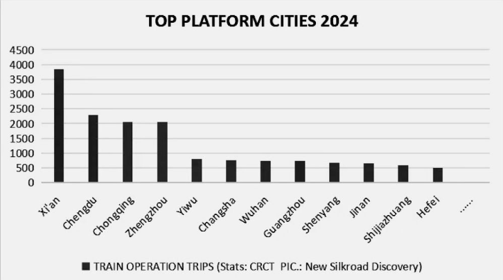 从城市角度来看,西安、成都、重庆和郑州仍然是开行中欧班列最多的城市。西安以3,849列的开行量位居榜首,同比增长12.1%,进一步巩固了其作为中欧货运枢纽的地位。成都则以2,285列紧随其后,其火车运营人次同比增长高达17.8%,超过了重庆的2,059列。郑州虽然位于中国中东部地区,但其在2024年的出境游人次同比增长达到了49.2%,显示出强劲的增长势头。此外,义乌、长沙、武汉、广州、沈阳、济南、石家庄和合肥等城市也是中欧货运班列的重要平台。这些城市通过中欧班列与欧洲建立了紧密的联系,为当地的经济发展注入了新的活力。