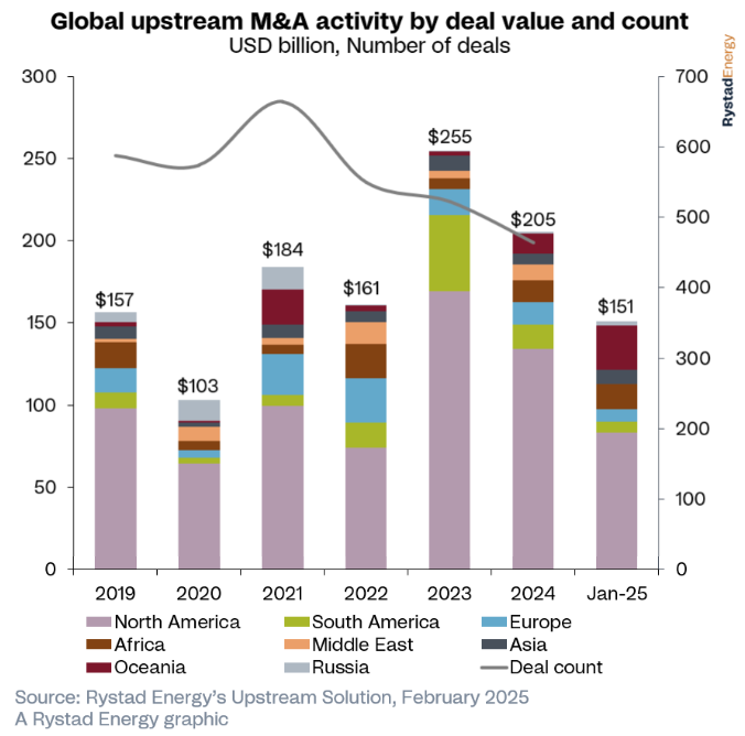 尽管美国页岩油行业推动的上游并购活动在经历两年创纪录交易后预计将大幅放缓,但全球范围内仍存在约1500亿美元的上游机会。这一预测基于行业整合已接近尾声,以及中东地缘政治紧张局势、乌克兰冲突和英国财政环境等多重因素的影响。北美地区将继续引领全球并购活动,市场上拥有近800亿美元的上游机会。在美洲其他地区,南美交易额显著增长,从2023年的36亿美元跃升至2024年的141亿美元,这主要得益于区域勘探和生产(E&P)的雄心壮志。然而,值得注意的是,巴西国家石油公司已暂停其撤资计划。在过去的一年里,美国页岩油行业经历了重要的整合阶段,以整合为重点的交易数量大幅增加。