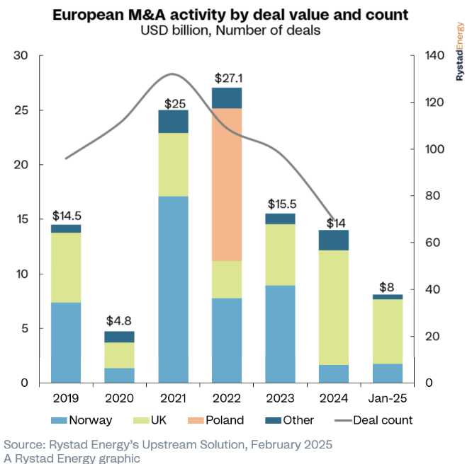 与此同时,欧洲的并购交易额在2024年同比下降约10%,至140亿美元。其中,英国占据了约75%的份额。英国的主要企业一直在采用自主模式战略来扩大其在北海的业务。今年最大的一笔交易涉及壳牌和Equinor合并其在英国北海的上游投资组合。然而,由于英国的财政政策收紧海上石油和天然气的财政条款,欧洲未来并购活动的前景仍然不确定。