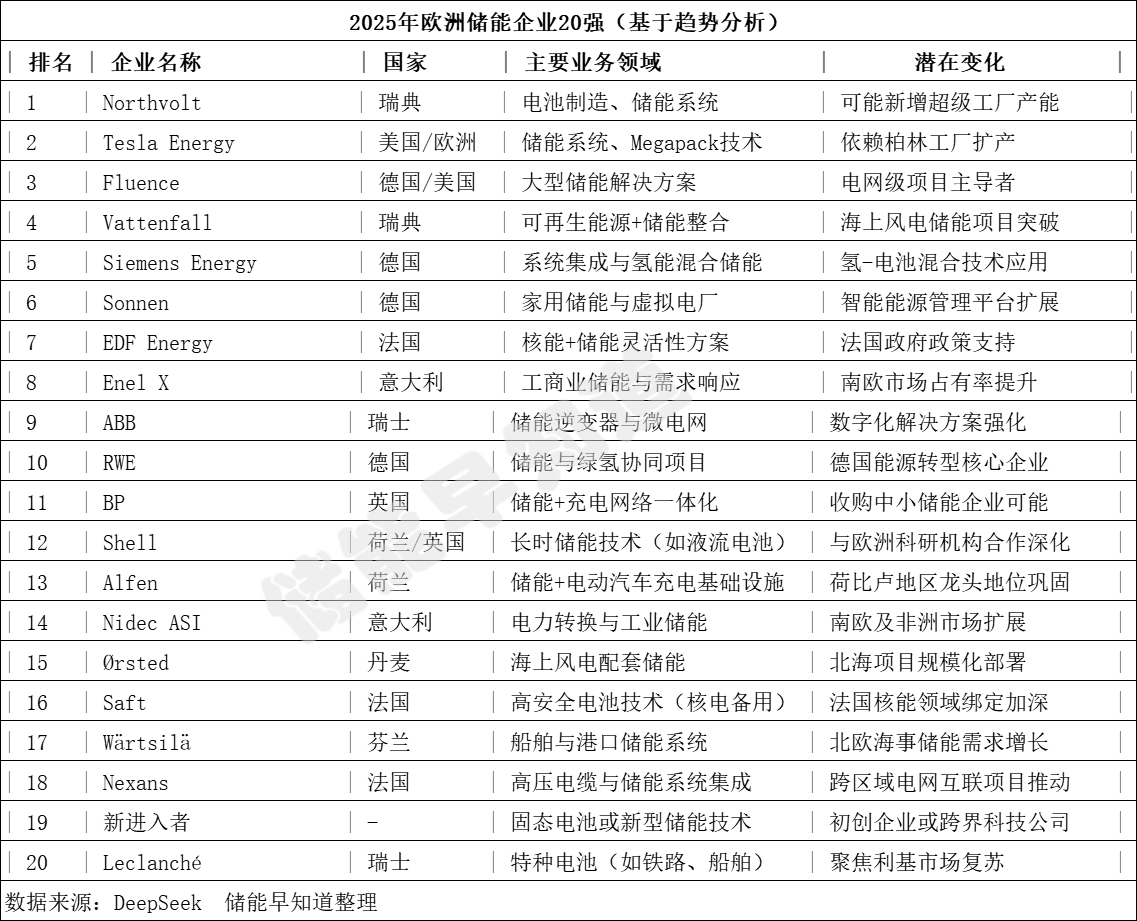 以下数据更新日期(2024年7月),基于行业发展趋势、企业动态和政策方向,DeepSeek可以推测2025年欧洲储能领域可能的领先企业及其业务方向。以下是“假设性分析”,仅供参考: