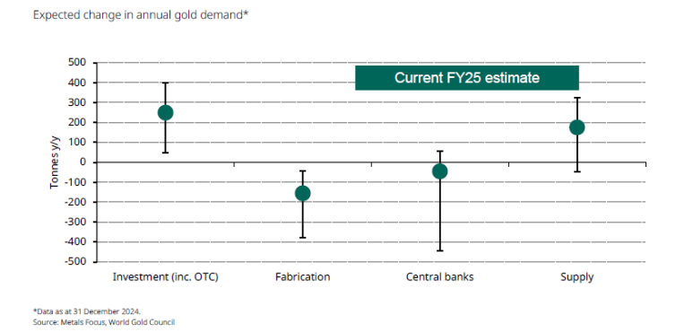 世界黄金协会高级市场分析师Louise Street表示:“到2025年,我们预计各国央行将继续占据主导地位,黄金ETF投资者也将加入竞争,特别是如果我们看到利率较低但波动较大的情况。”她还指出,“地缘政治和宏观经济不确定性应该是今年的普遍主题,这将支持对黄金作为财富储存和对冲风险的需求。”除了投资需求外,2024年的金饰消费下降了11%,成为最大的实物需求类别中的下滑部分。而金矿产量保持稳定,回收量则增长了15%。世界黄金协会预计,由于价格高企,今年的金饰需求将持续承压,同时回收率将进一步上升。