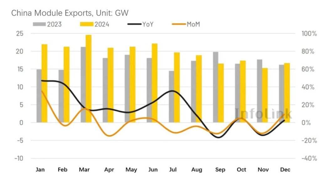 在光伏组件方面,市场研究机构InfoLink根据海关数据发布的分析报告指出,2024年1月至12月,中国光伏组件出口总量为235.93吉瓦(GW),较2023年同期的207.99GW增长13%。其中,12月出口量约为16.63GW,环比增长9%,主要进口国包括巴西、荷兰、印度、沙特阿拉伯和西班牙,这些国家的总进口量约占全球市场的42%。