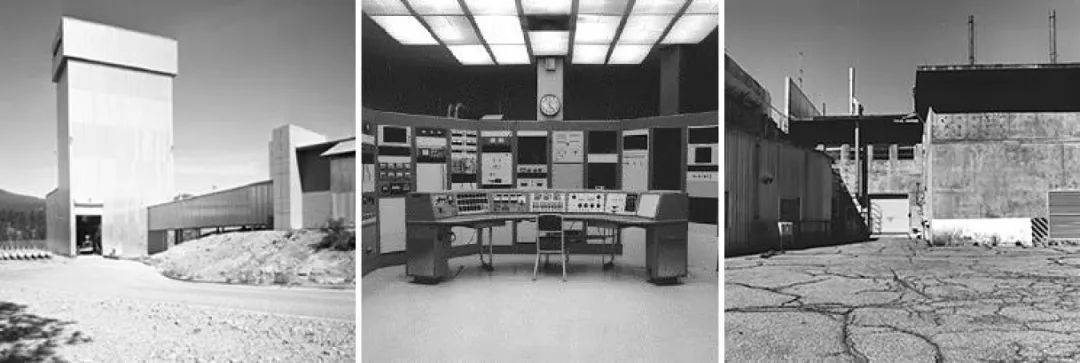 离子束设施的历史照片。左图:塔内安装有垂直加速器,右侧有隧道将其与办公楼连接起来。中图:垂直范德格拉夫加速器的控制室。右图:离子束设施的南侧。设施行政楼的拆除工作预计将于今年秋季开始。停用、退役和拆除项目预计将持续五年。