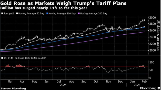 金价在经历两个月来最大盘中跌幅后,重新回到关键的 2,900 美元水平。市场对即将到来的贸易战的担忧持续支撑避险需求,推动黄金价格回升。周一下午晚些时候,4 月交割的美国黄金期货价格上涨 0.4%,至每盎司 2,911 美元。尽管此前几个交易日金价已达到超买水平,但在假期清淡的交易中仍出现上涨。与此同时,美元徘徊在两个月低点附近,使得以其他货币计价的黄金价格更具吸引力。