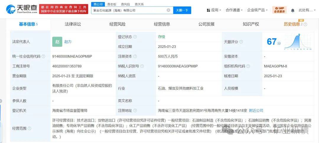 天眼查App显示,近日,紫金石化能源(海南)有限公司成立,法定代表人为赵力,注册资本500万人民币,经营范围含技术进出口、货物进出口、石油制品销售、润滑油销售、专用化学产品销售、化工产品销售等。股东信息显示,该公司由紫金矿业旗下紫金石化能源有限公司全资持股。