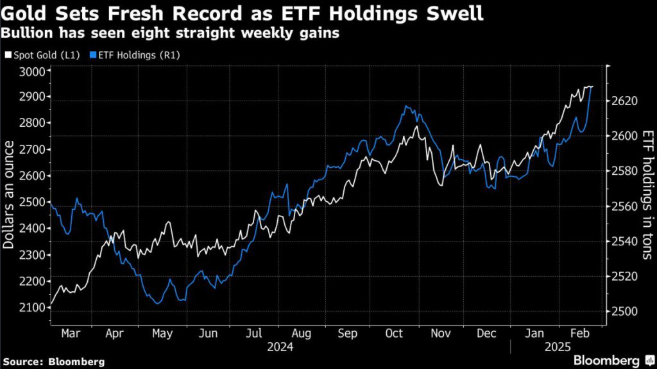 黄金价格周一创下每盎司2,956.19美元的历史新高,超过上周四的前峰值,随后略有回落。这是金价连续第八周上涨,创下自2020年以来的最长连涨纪录。上周,黄金支持的交易所交易基金(ETF)录得自2022年以来的最大净流入,显示出投资者对贵金属的强烈兴趣。