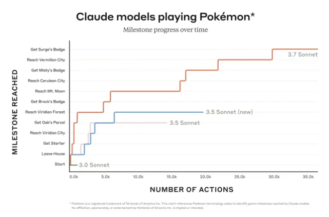 Claude 3.7 Sonnet 的核心优势在于“扩展思考”功能。与 OpenAI 的 o3-mini 和 DeepSeek 的 R1 类似,该模型能通过增加计算资源和时间,逐步推理解决复杂问题。这一能力在 Pokémon Red 中得到验证。相比之下,前代模型 Claude 3.0 Sonnet 甚至未能离开起始地 Pallet Town,而 Claude 3.7 Sonnet 成功击败三位道馆馆主,赢得徽章,显示出显著进步。Anthropic 透露,模型执行约 3.5 万次操作才达到第三位馆主 Surge,但未具体披露所需计算资源和时间。