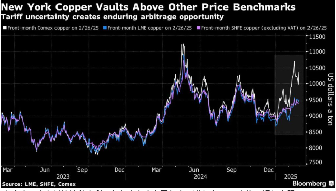 套利交易通常会使全球金属价格迅速恢复同步,但近期美国铜价的持续溢价反映了市场对特朗普关税政策的不确定性。本月早些时候,纽约商品交易所铜价较伦敦金属交易所价格溢价高达每吨1300美元,随后收窄至600美元左右,但在特朗普宣布调查后再次扩大。