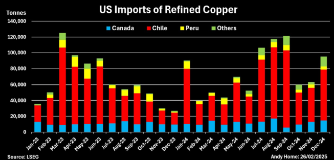 自特朗普1月上任以来,美国已推出一系列新进口税政策,针对金属和机动车辆的更广泛关税将于下月生效。必和必拓(BHP)、嘉能可(Glencore)和英美资源集团(Anglo American)等国际矿业巨头在智利运营,其中国有生产商Codelco拒绝就此发表评论。