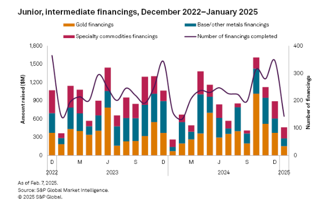 然而,初级和中级矿业公司的融资表现不佳,成为1月份唯一下降的PAI指标。该行业总融资额下降48%至4.63亿美元,交易总数下降近60%至143笔,创下三年来的最低月度总额。重大融资(超过200万美元的交易)数量从12月的66笔降至31笔,仅有一笔交易价值超过5,000万美元。黄金相关融资连续第三个月下降,降幅达59%,交易数量也创下多年新低。