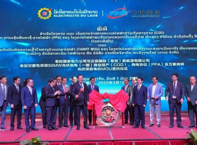 3月1日,云南能投集团所属云能国际(老挝)新能源公司与老挝国家电力公司(EDL)在老挝首都万象举行签约仪式,双方签署了老挝甘蒙色邦菲50.1MW 光伏项目(一期)购电协议(PPA),项目正式商业投产(COD),进入实质性运营新阶段。仪式上还签署了万象纳蚌光伏项目电价备忘录(MOU)等系列重要协议,在“一带一路”建设宏大背景下,助力中老国际能源合作迈向新高度。
