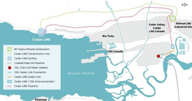 该项目涉及在不列颠哥伦比亚省基蒂马特附近建造一个浮动液化天然气终端,预计将于2025年中期开始施工。Cedar LNG将从加拿大西部采购天然气,生产液化天然气出口到亚洲市场,年产能为330万吨。
