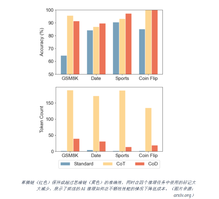 CoD 技术使大型语言模型(LLM)能够以最少的字数解决问题,仅需当前方法所需文本的 7.6%。这一方法不仅降低了成本,还减少了计算资源的消耗。研究团队在上周发布于 arXiv 的论文中指出:“通过减少冗长内容并专注于关键见解,CoD 在准确性上匹配或超过思维链(CoT),同时显著降低了各种推理任务的成本和延迟。”