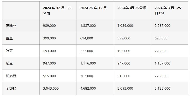 ABARES对澳大利亚五种主要豆类作物总产量的预测现上调至512.5万吨,高于12月份的468.2万吨。