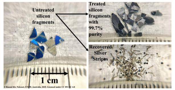 澳大利亚悉尼的新南威尔士大学(UNSW)的一个研究小组近日宣布,他们成功地从光伏电池层中回收了硅(Si)、银(Ag)和锡(Sn)。这一创新方法不仅回收了大部分银(达到70 wt%),而且加工后的硅纯度超过了99.7 wt%。