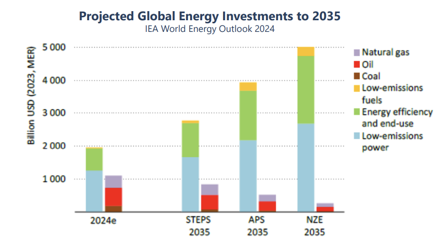 国际能源署(IEA)已概述了许多可能的脱碳途径,以实现能源转型目标。即使在IEA与既定政策情景(STEPS)相关的最保守选项中,到2035年也需要每年额外投资约8000亿美元用于清洁能源。这相当于在实现承诺情景(APS)下每年需要约2万亿美元的增量投资,而在净零排放(NZE)情景下则需要约3万亿美元。