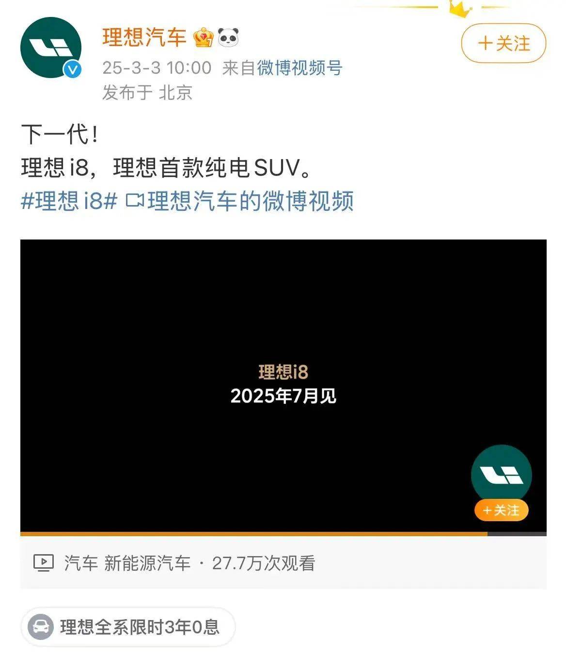 3月3日,理想汽车宣布,旗下首款纯电SUV——理想i8将于今年7月发布上市,同时发布首支预告视频。