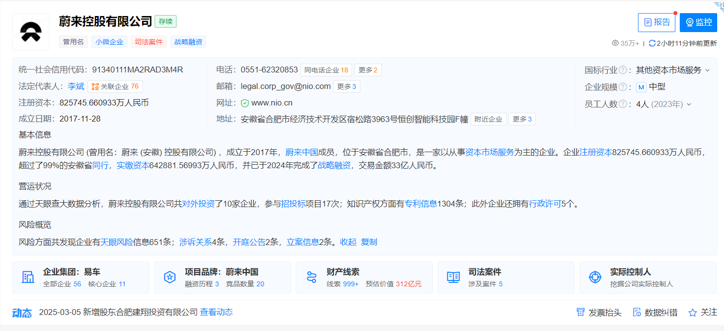 3月6日消息,据天眼查官网显示,蔚来控股有限公司于近日发生工商变更,新增合肥建翔投资有限公司、安徽高新舆文蔚源科技合伙企业(有限合伙)为股东,同时注册资本由约78.57亿人民币增至约82.57亿人民币。