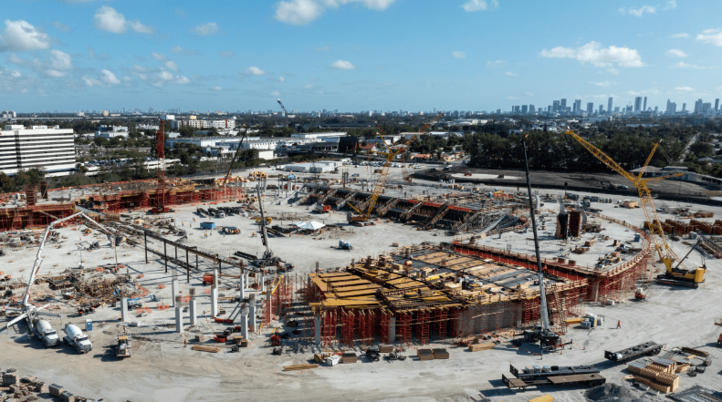 近日,迈阿密自由公园的建设正在如火如荼地进行中,体育场西侧的建筑钢结构正在拔地而起,这里是体育场大部分高级设施的所在地,下层和上层座位的主要混凝土浇筑工作也在顺利进行中。随着上层斜梁的安装,体育场碗形结构正在成型,主大厅也已接近完工。现场,地下设施正在推进,关键基础设施正在安装中。接下来,工作人员正在为即将到来的预制安装和顶篷钢结构做准备。