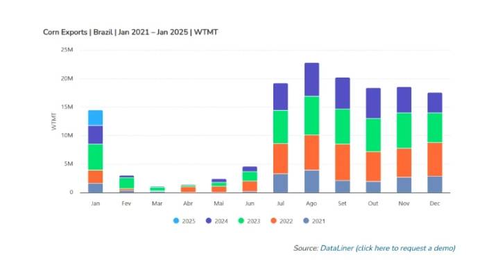 下图显示了 2021 年 1 月至 2025 年 1 月期间巴西的玉米出口量。