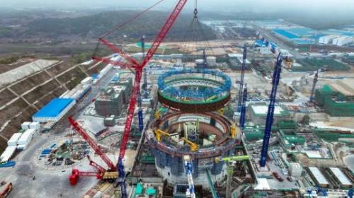 2025年3月2日,陆丰核电6号机组核岛安全壳钢衬里牛腿模块经起钩、悬停、回转、带载行走、落钩、就位、调整等一系列标准化动作精准实施后,历时2小时40分钟顺利吊装就位。