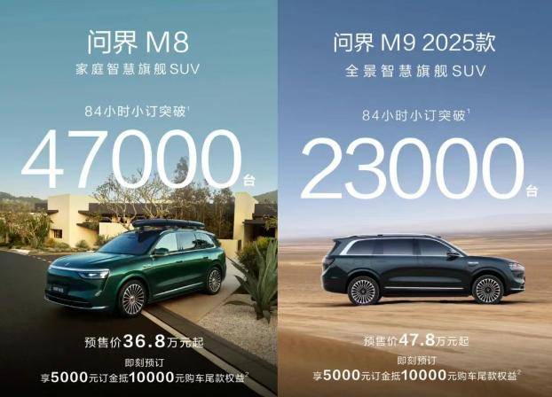3月10日消息,鸿蒙智行官方于近日宣布,旗下的问界M8车型和2025款问界M9车型84小时小订分别突破4.7万台和2.3万台。